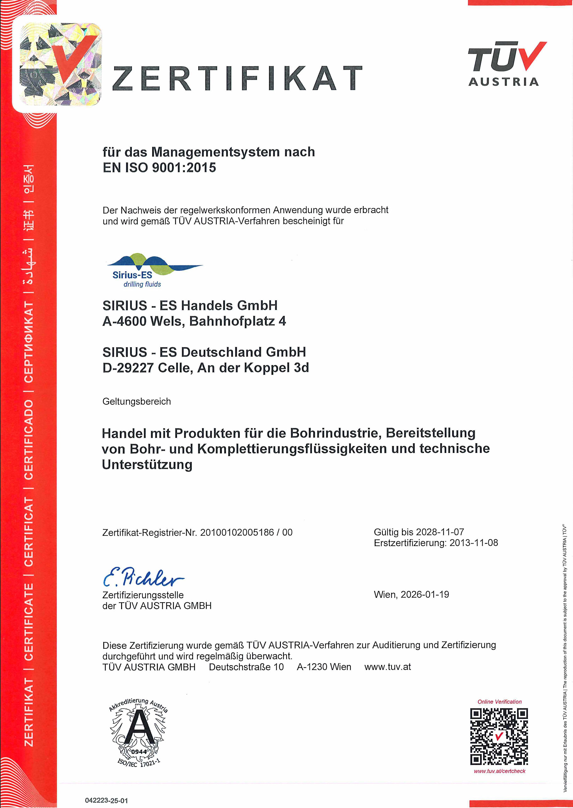 Sirius-ES ist bestrebt, die Qualitätserwartungen unserer Kunden, der Gesetzgeber und der Behörden zu erfüllen und pflegt dabei ein Managementsystem für alle unsere Niederlassungen, das gemäß den Anforderungen der EN ISO 9001 zertifiziert ist.