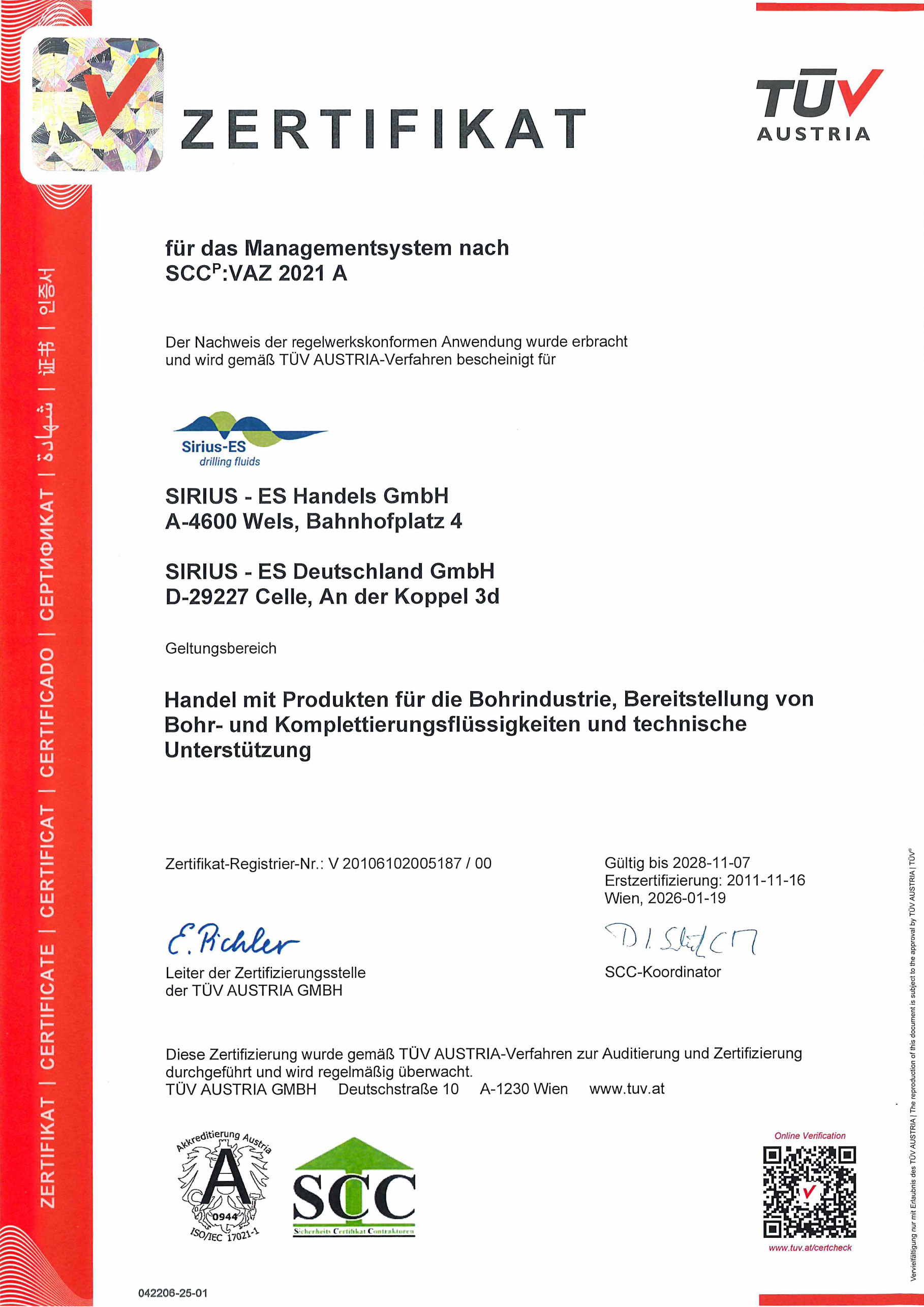 Seit 2011 sind wir nach SCCᵖ (Safety Certificate Contractors Petrochemie) zertifiziert und erfüllen damit höchste Anforderungen an Arbeitssicherheit und Gesundheitsmanagement in der petrochemischen Industrie.